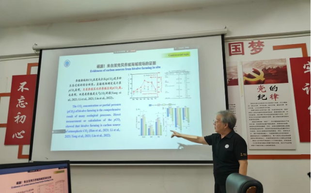 董双林教授以“贝类养殖碳汇作用的时空尺度和定量方法”为题,深入剖析了牡蛎养殖生态系统、贝藻混养系统和泥螺养殖生态系统中的水环境、贝类代谢及碳封存作用,详细阐述了贝类养殖生态系统的观测证据、碳封存量评估方法以及双壳贝类养殖碳汇研究的方法论,使与会者深刻理解了贝类养殖在海洋碳汇中的重要作用。其深入浅出的讲解和丰富的实例,使讲座内容既具学术性又具实用性,赢得了在场专家、学者及师生的一致好评。
