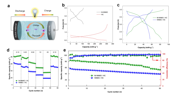 商用钠离子电池中使用的一种主要正极材料是O3型NaNi0.5Mn0.5O2。这种材料的应用受到多级相变和空气稳定性不足的阻碍。在这项研究中,开发了一种源自Ni-MOFs的创新型O3型NaNi0.5Mn0.5O2(简称 M-NNMO)作为钠离子电池的正极材料。M-NNMO阴极在2.0至4.0 V内以0.1 C的速率表现出 124 mAh·g-1 的放电比容量。此外,这种材料在经过100次循环后表现出令人印象深刻的75%容量保持率。Ni-MOFs可以通过增强过渡金属-氧键和扩大Na层间隙来抑制复杂的相变并同时提高离子扩散速率,这是显着提高性能的原因。重要的是,在空气稳定性测试中,基于 Ni-MOFs 的独特结构特性,M-NNMO过渡金属层的稳定性得到了增强。这项工作将为设计性能优越的钠离子电池正极材料提供理论指导。研究得到国家自然科学基金、海南省自然科学基金等项目联合资助。
