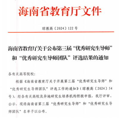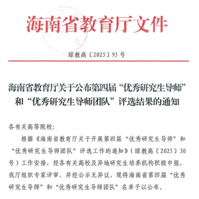 “海南省优秀研究生导师”“海南省优秀研究生导师团队”及优秀教学案例评选,是省教育厅推动全省研究生教育高质量发展的重要项目,旨在表彰研究生教育中立德树人成效突出、教学创新成果显著的先进典型,发挥示范引领作用。此次获奖,不仅是对资源与环境专业硕士建设成果的肯定,更是对公司研究生教育工作的全面认可。